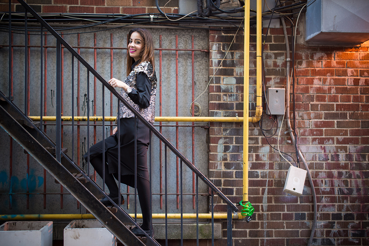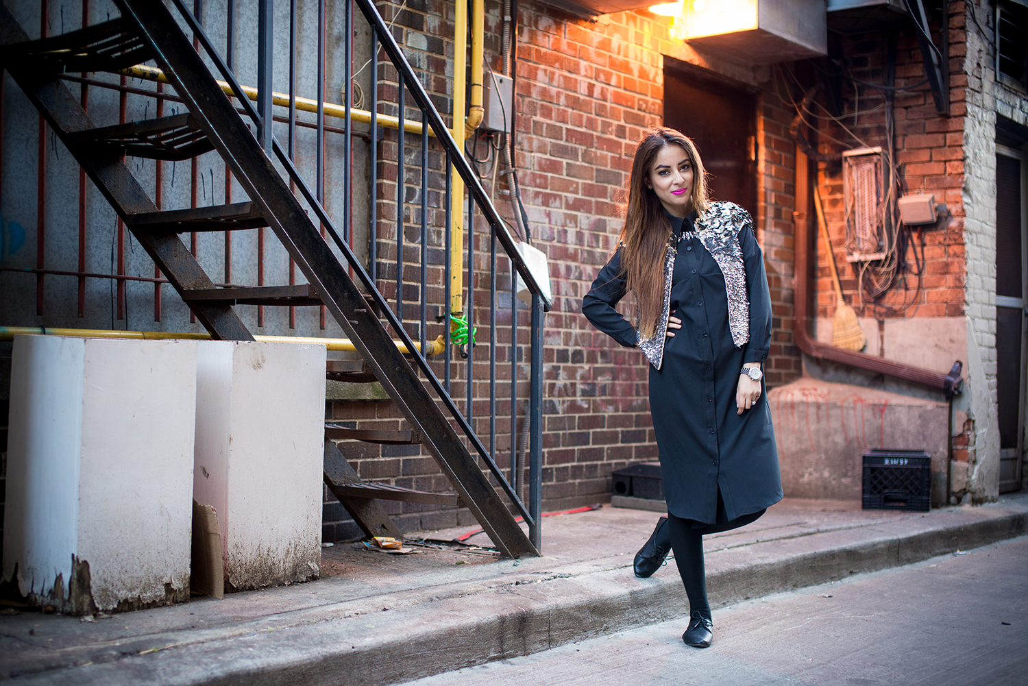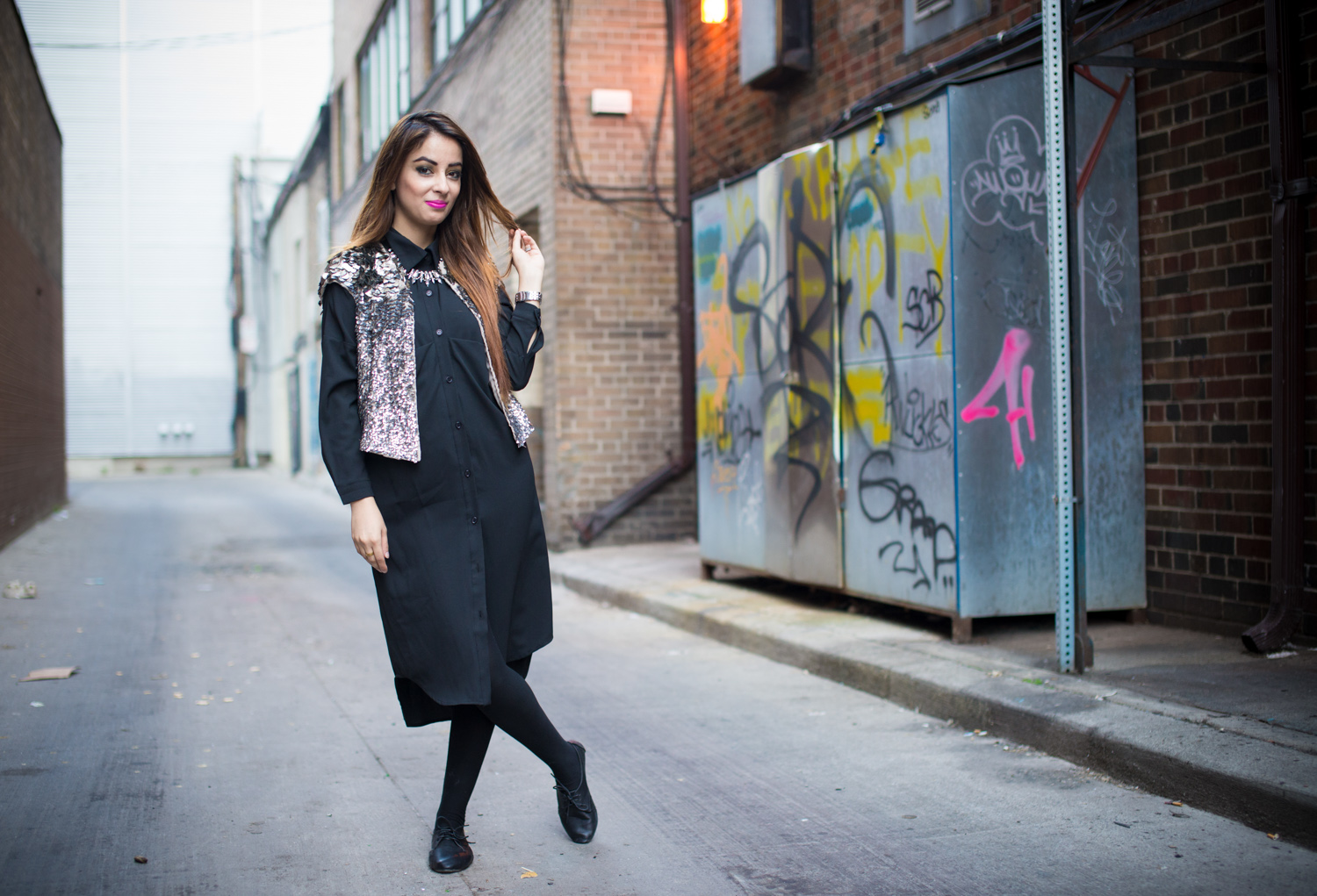 This is my “I’m working all day and have a dinner to attend at night” look. I’ve worn an all black button up with a sequenced vest to add some sparkle to the ensemble.